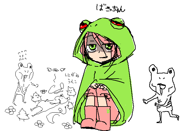 服装: 緑レインコート、白Tシャツ、ピンクハーフパンツ、緑長靴、ヘアバンド